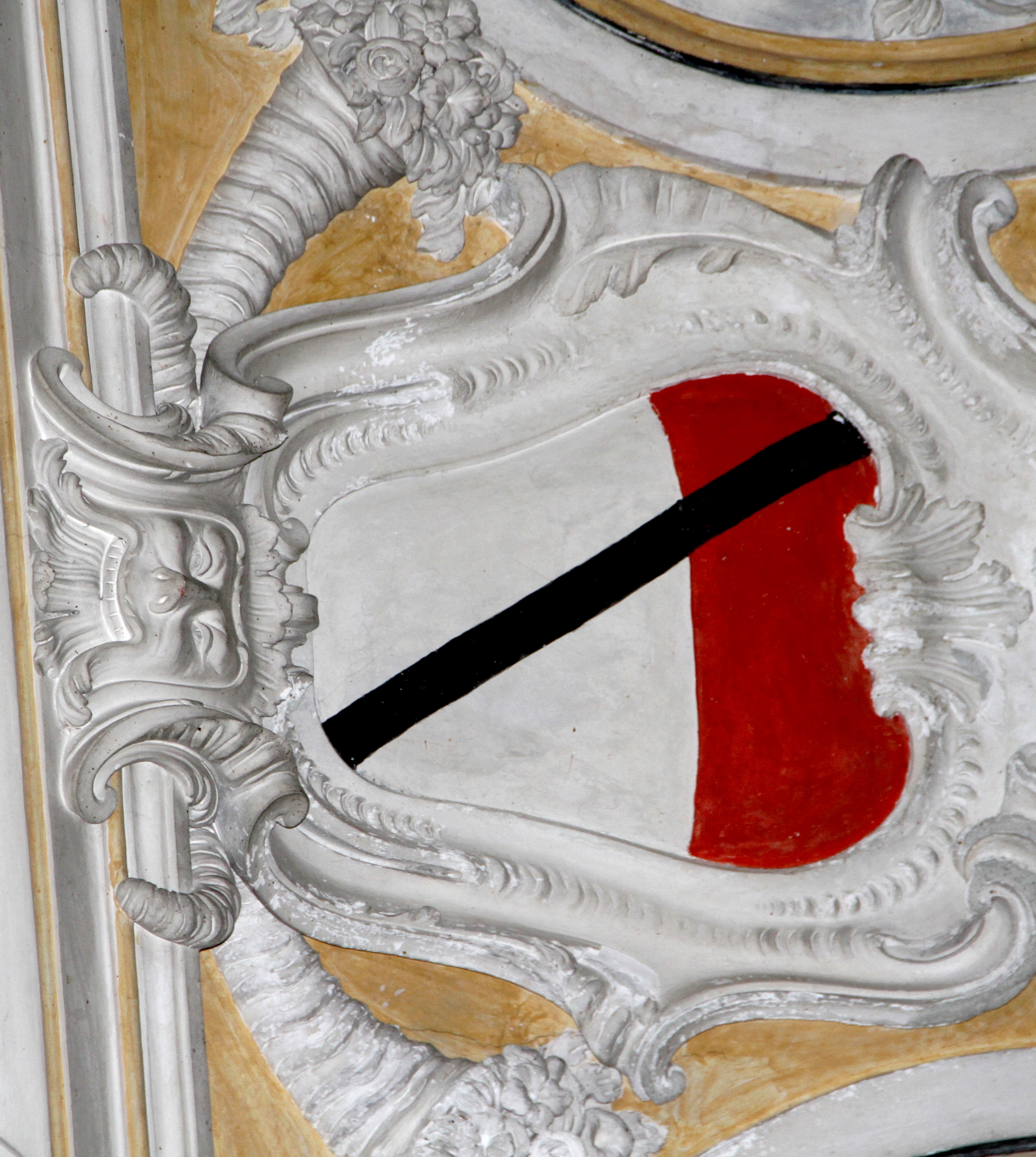 Armoiries de la famille Challant, peintes dans le décor en stucs du grand salon du château Passerin d'Entrèves et de Courmayeur à Châtillon.