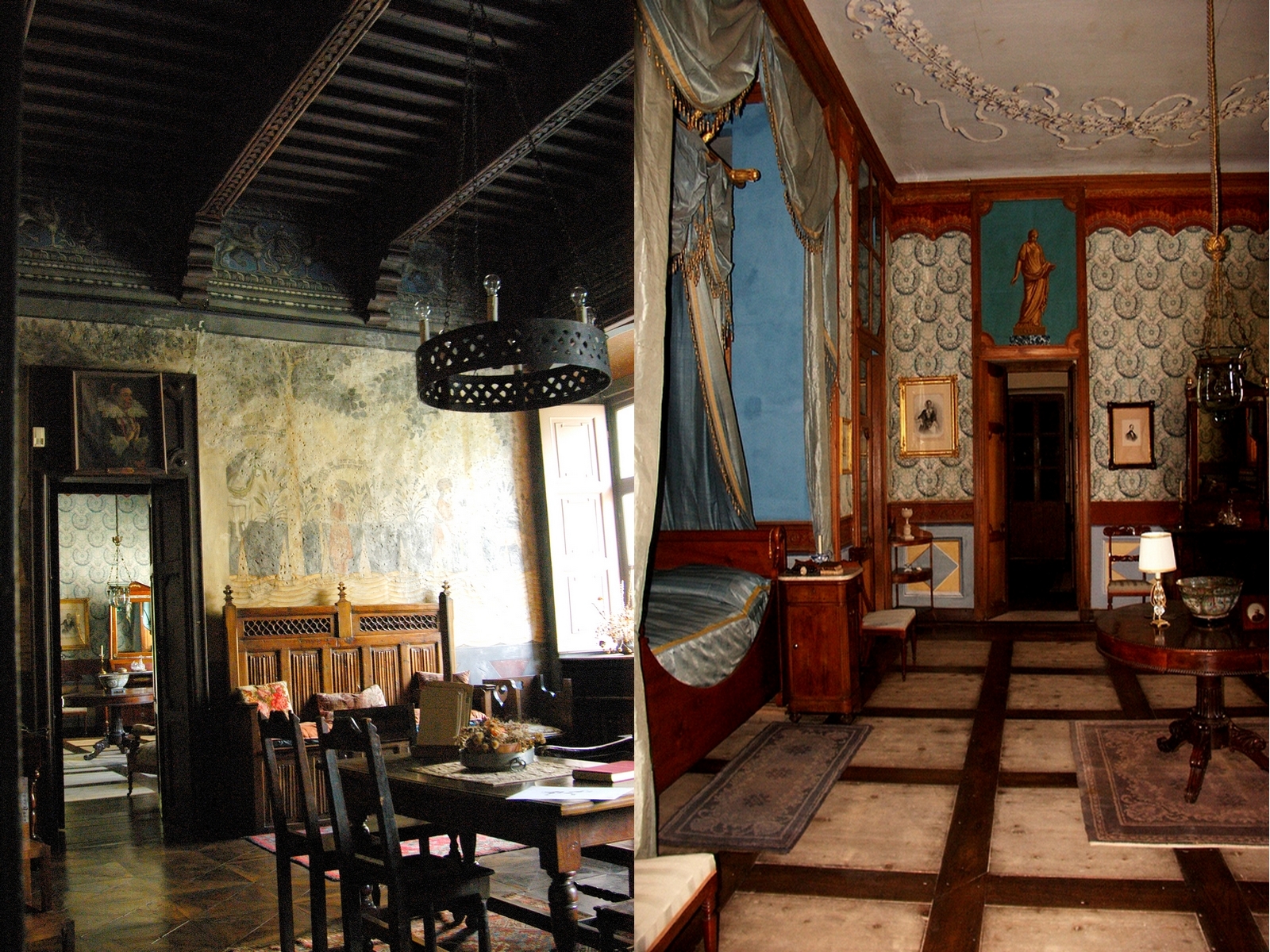 A gauche : la bibliothèque actuelle, salle où étaient autrefois conservées les Archives des Challant. A droite : la chambre dite chambre bleue actuellement. On comprend ici a quel point il est difficile de remonter dans le temps, dans des décors bien plus récents, et après les reconstructions lourdes voulues par les Challant et les Passerin d'Entrèves et de Courmayeur au XVIIIe et XIXe siècles (photos collection privée)