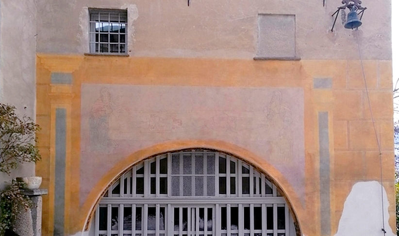 Chapelle du Château de Châtillon, avant (gauche) et après (droite) les travaux de restauration réalisés par Erika Favre à l'été 2022. La fresque originelle, sans doute d'après 1578, correspond au passage (avec permanence et ostension de quelques jours) du Saint-Suaire dans cette chapelle, qui ouvrait le droit à le représenter dans la décoration externe des lieux par lequels il transitait.