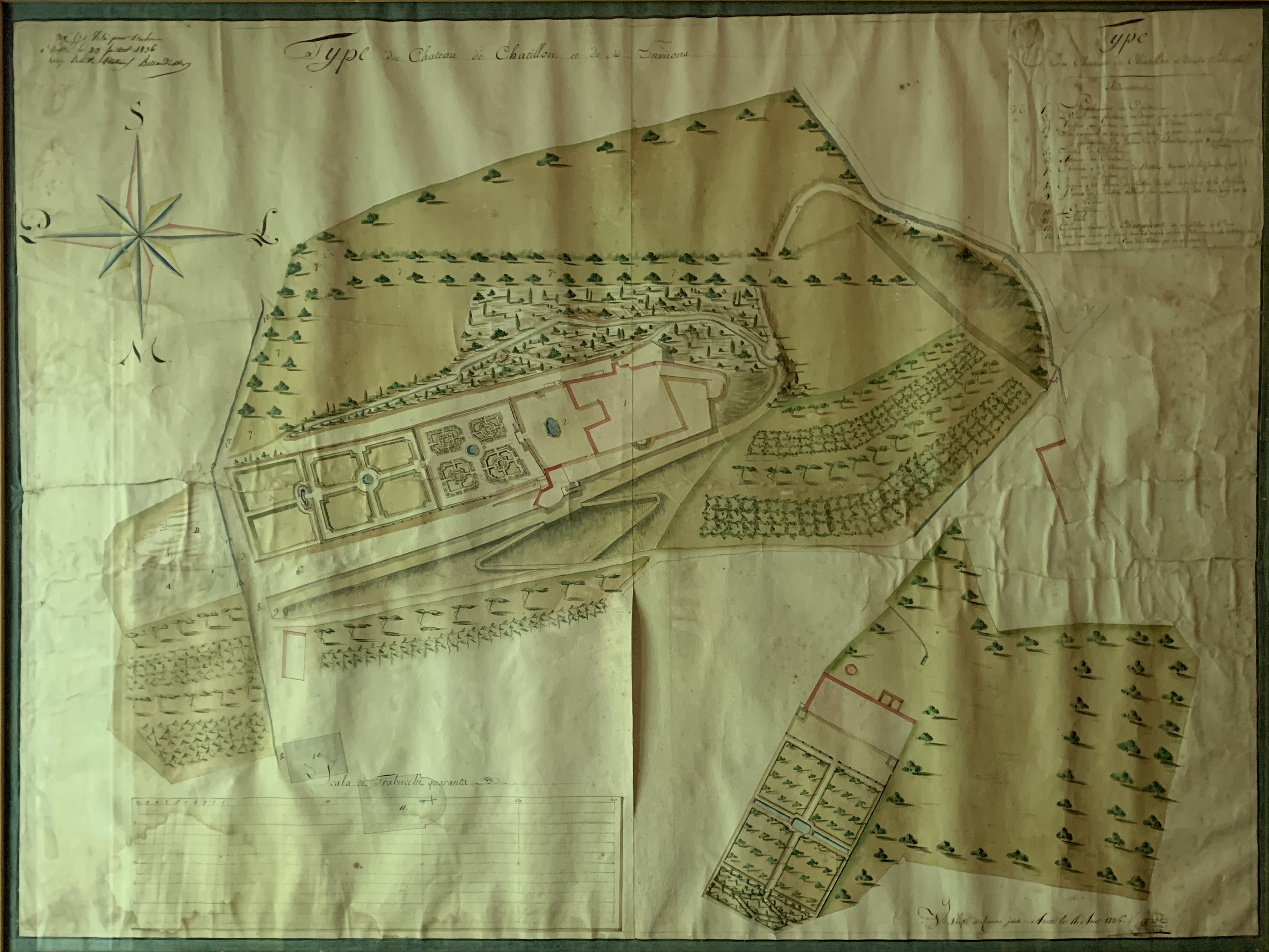 Plan du Château et parc de Châtillon, sur un document de 1836, avant les travaux de remaniement de la tour romaine (tracée en rouge sur le plan) et de la construction de la maison des gardiens (collection privée).