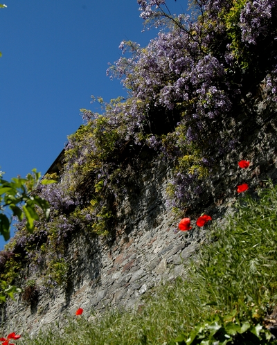 En contrebas de la façade sud du château, et de la maison de gardiens, trois terrassses permettent encore de cultiver quelques arbres fruitiers, et des plantes rampantes le long de l'ancien mur d'enceinte du château. Une glycine très ancienne et très spectaculaire y fleurit en saison. A l'abri du vent du nord, et réchauffées par la chaleur réfléchie par la muraille épaisse, d'autres cultures potagères y trouvent un micro-climat idéal, que les rigueurs du climat alpin de permettraient pas de cultiver normalement. La neige, le vent, des températures largement inférieures aux 0° C sont assez fréquentes à Châtillon durant les mois d'hiver. |