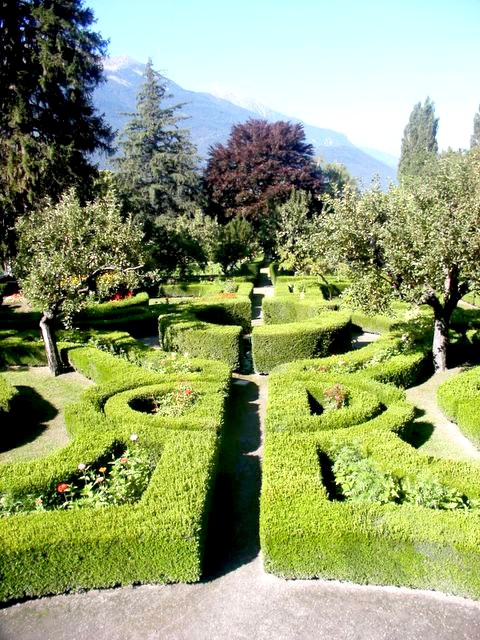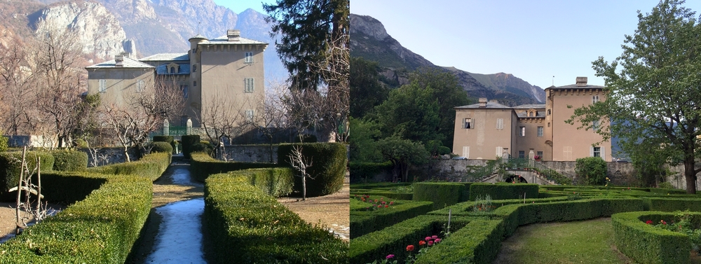 Ni jardin à la française (buis trop hauts, arbres fruitiers ou non, fleurs diverses, massifs de rosiers...), ni jardin à l'italienne (pas de sculptures, pas de haies hautes, pas de recherche d'utilisation du relief...), ce jardin est original dans sa forme comme dans les conditions, dures malgré tout, qu'il doit subir en hiver, par 550 m d'altitude, dans une des régions les plus froides d'Italie. En 1855, on démolit la tour octogonale romaine pour construire une orangerie, entre autres, où hivernaient encore il y à peu d'années citronniers et lauriers roses, qui ornaient les allées du jardin autant que l'esplanade autour du château. Mais l'orangerie restructurée en maison de gardiens, les plantes décoratives hivernent désormais dans les sous-sols du château. Quelques bancs agrémentent le jardin et l'esplanade autour du château. |